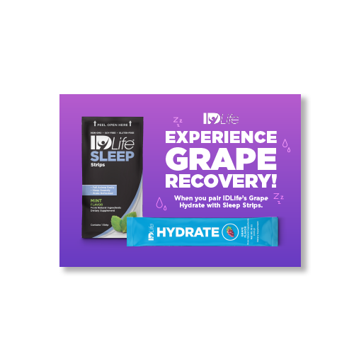 When you purchase this special promotional Hydrate pack, you’ll receive 5 trial cards with one IDLife Hydrate stick in Grape flavor and one IDLife Sleep Strip attached to each one.